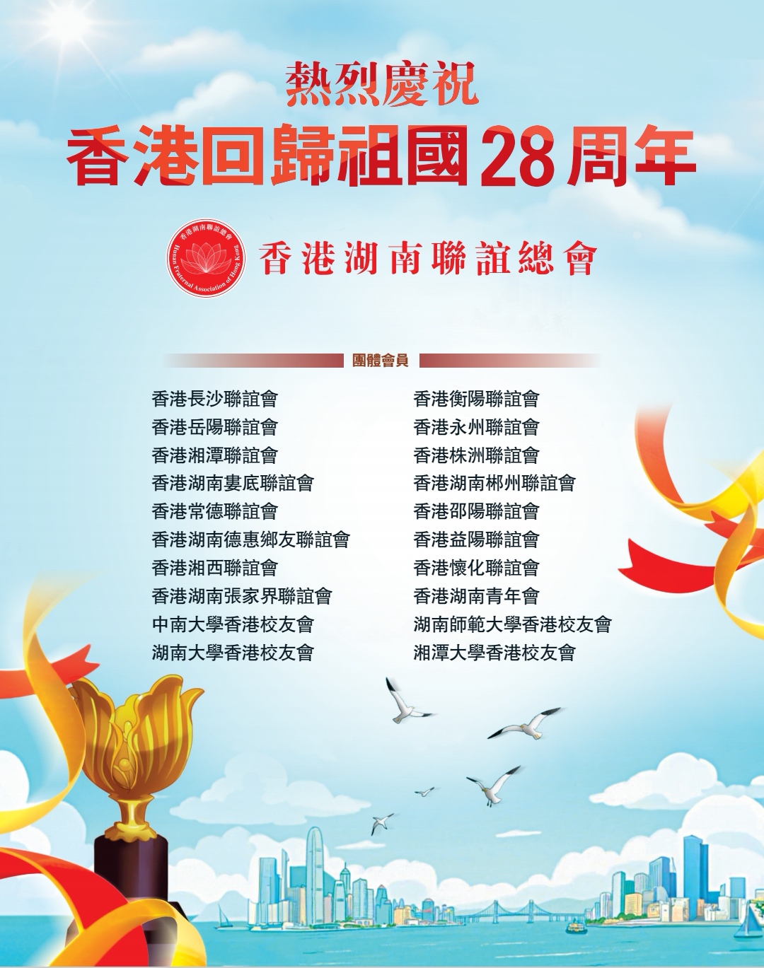 在喜迎香港回歸祖國28週年的光輝時刻,香港湖南聯誼總會攜全體團體會員單位謹向全港市民及偉大祖國致以最熱烈的祝賀與誠摯的祝福!